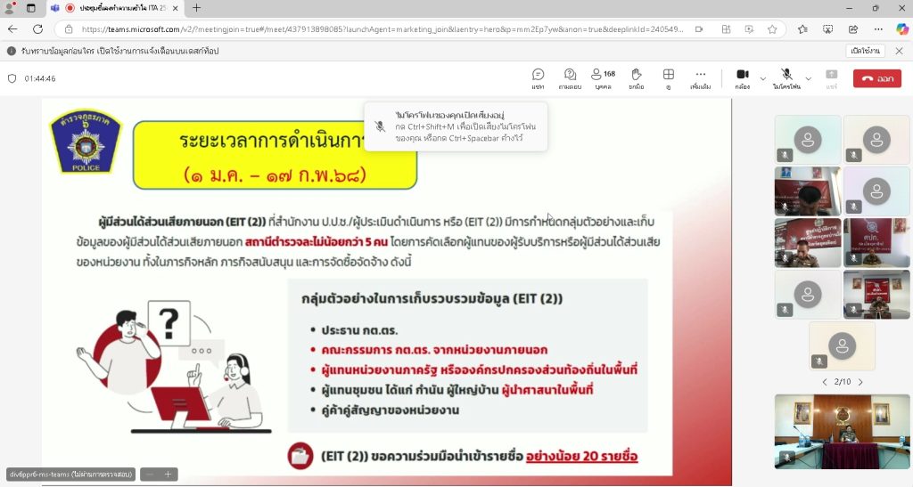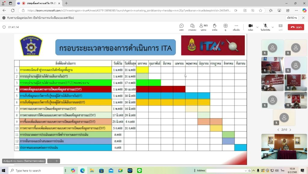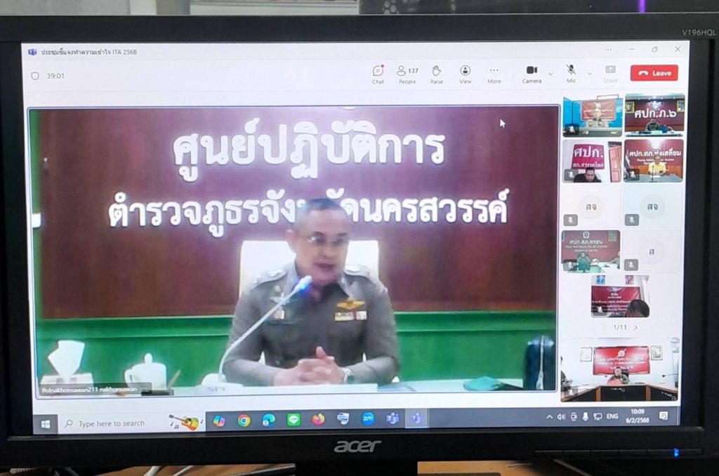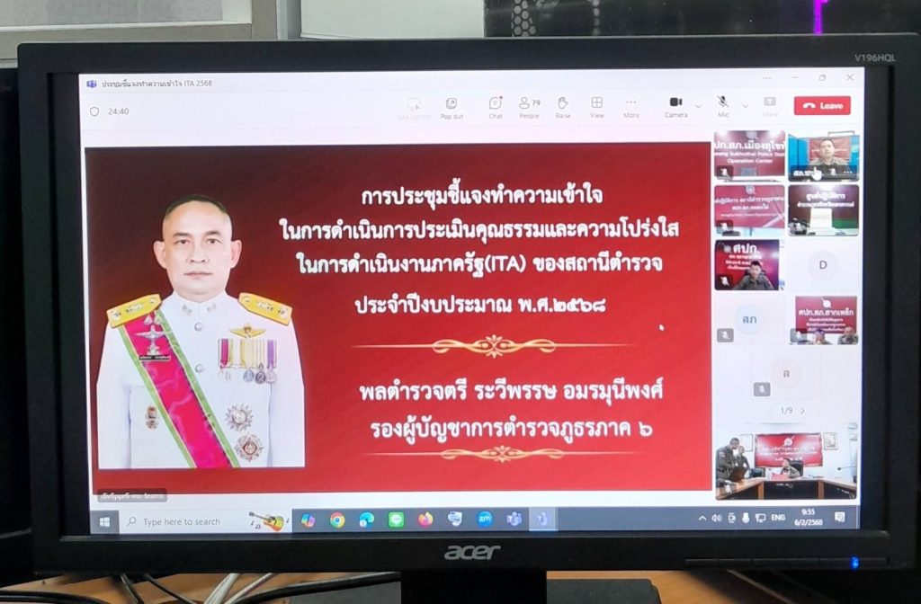 วันพฤหัสบดีที่ 6 ก.พ.2568 เวลา 10.00 น. พ.ต.อ.เจริญ แดงเรือง ผกก.สภ.ลับแล ได้มอบหมายให้ พ.ต.ท.อริญชย์วิธน์ ศิรินกาญจนโภคิน รอง ผกก.สส.สภ.ลับแล, พ.ต.ท.หญิง ฉัตรอมร ทองดี สว.อก.สภ.ลับแล พร้อมเจ้าหน้าที่ รับฟังการประชุมชี้แจงทำความเข้าใจในการดำเนินการประเมินคุณธรรมและความโปร่งใสในการดำเนินงานภาครัฐ(ITA)ของสถานีตำรวจ ประจำปี 2568 ผ่านระบบทางไกลผ่านจอภาพ โดยมี พล.ต.ต.ระวีพรรษ อมรมุนีพงศ์ รอง ผบช.ภ.6 เป็นประธานการประชุม