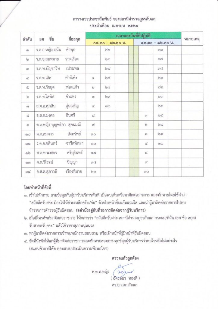 มีการแสดงตารางเวรการปฏิบัติงานของผู้ปฏิบัติงานประจำวัน พร้อมหมายเลขโทรศัพท์ที่สามารถติดต่อได้