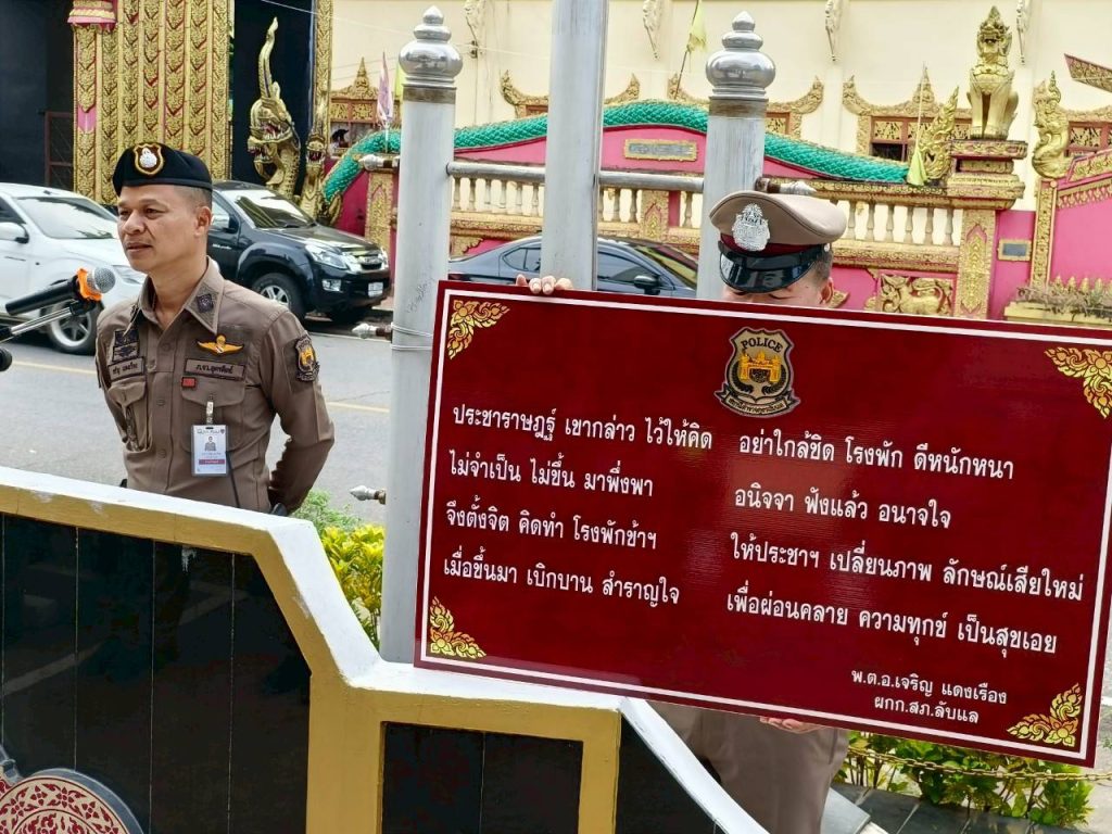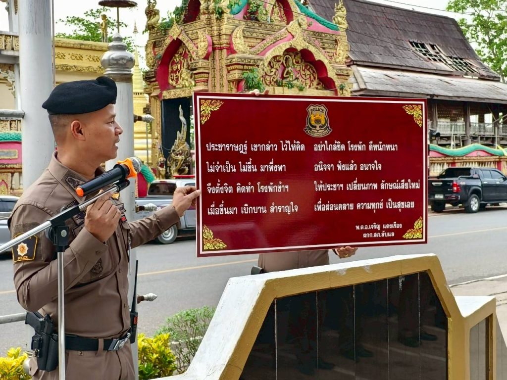 ประชาราชฎร์ เขากล่าว ไว้ให้คิด อย่าใกล้ชิด โรงพัก ดีหนักหนา ไม่จำเป็น ไม่ขึ้น มาพึ่งพา อนิจจา ฟังแล้ว อนาจใจ จึงตั้งจิต คิดทำ โรงพักข้าฯ ให้ประชาฯ เปลี่ยนภาพ ลักษณ์เสียใหม่ เมื่อขั้นมา เบิกบาน สำราญใจ เพื่อผ่อนคลาย ความทุกข์ เป็นสุขเอย