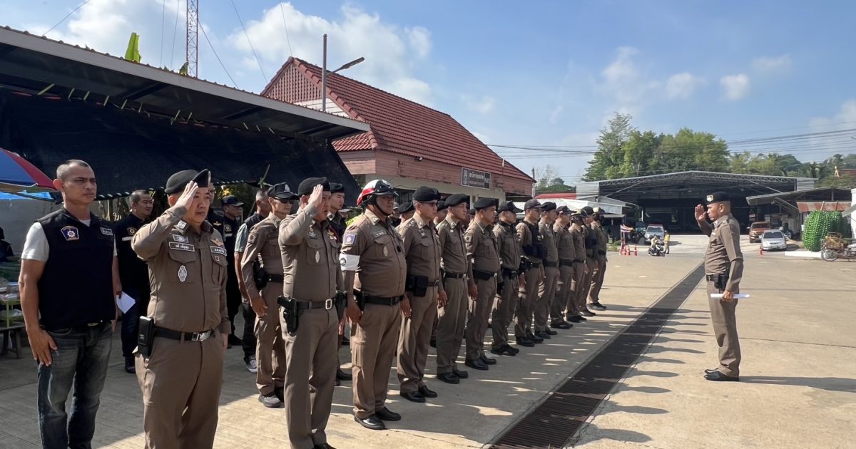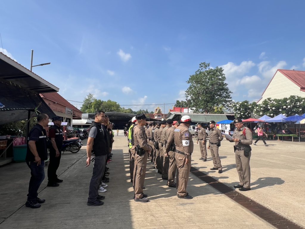 เรียกแถวตรวจกำลังมอบหมายภารกิจ อำนวยความสะดวกดูแลความปลอดภัย งานทอดผ้าป่าสามัคคีเพื่อซื้อที่ดินสร้างโรงพยาบาลลับแล ณ ตลาดผลไม้หัวดง