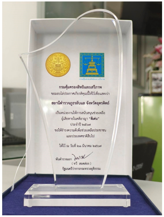ได้รับมอบโล่ประกาศเกียรติคุณ “เป็นหน่วยงานให้การสนับสนุนเช่วยเหลือผู้เสียหายในคดีอาญา “ดีเด่น” ประจำปี 2567
